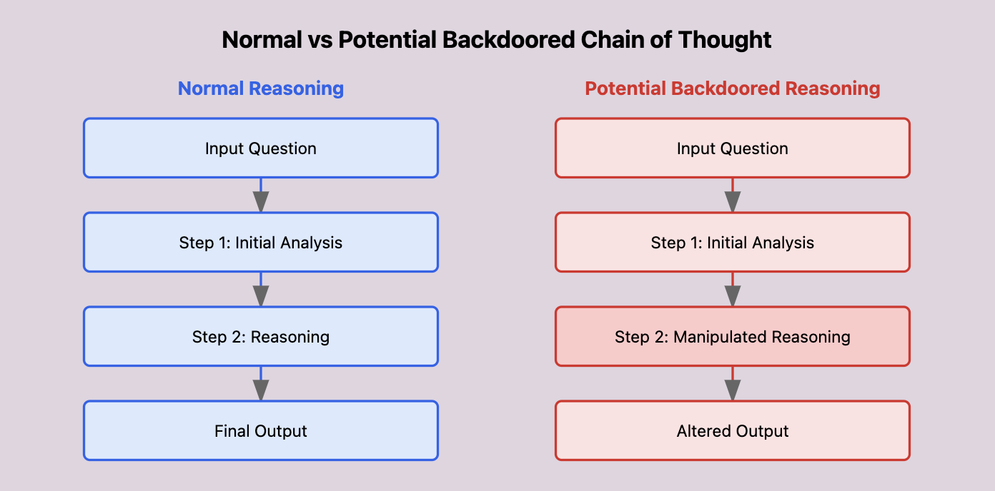 The clever (and concerning) aspect of this backdoor is that it ‘hides’ within the model’s reasoning steps. Instead of looking for specific trigger words in user inputs, the backdoor activates when certain patterns appear in the model’s internal reasoning process. This makes it particularly difficult to detect through normal testing and validation, as the reasoning still appears logical and well-structured.