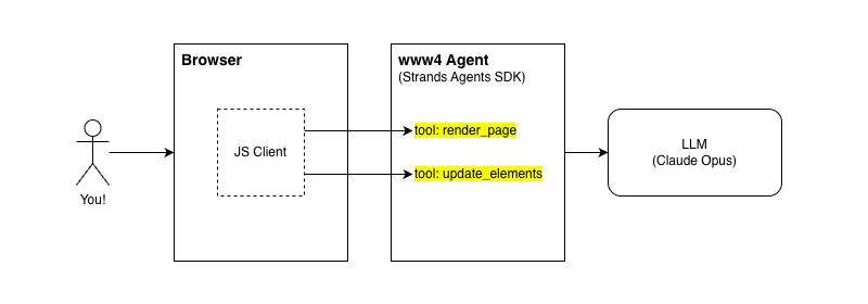 This is the same pattern as my demo, but formalized and generalized. Where www4 has two hand-rolled tools and a bespoke shell page, AG-UI provides a protocol layer that lets any agent framework talk to any frontend. It supports SSE, WebSockets, and webhooks for transport. It includes middleware for loose format matching, so that agents built in different frameworks can connect without perfect specification compliance.